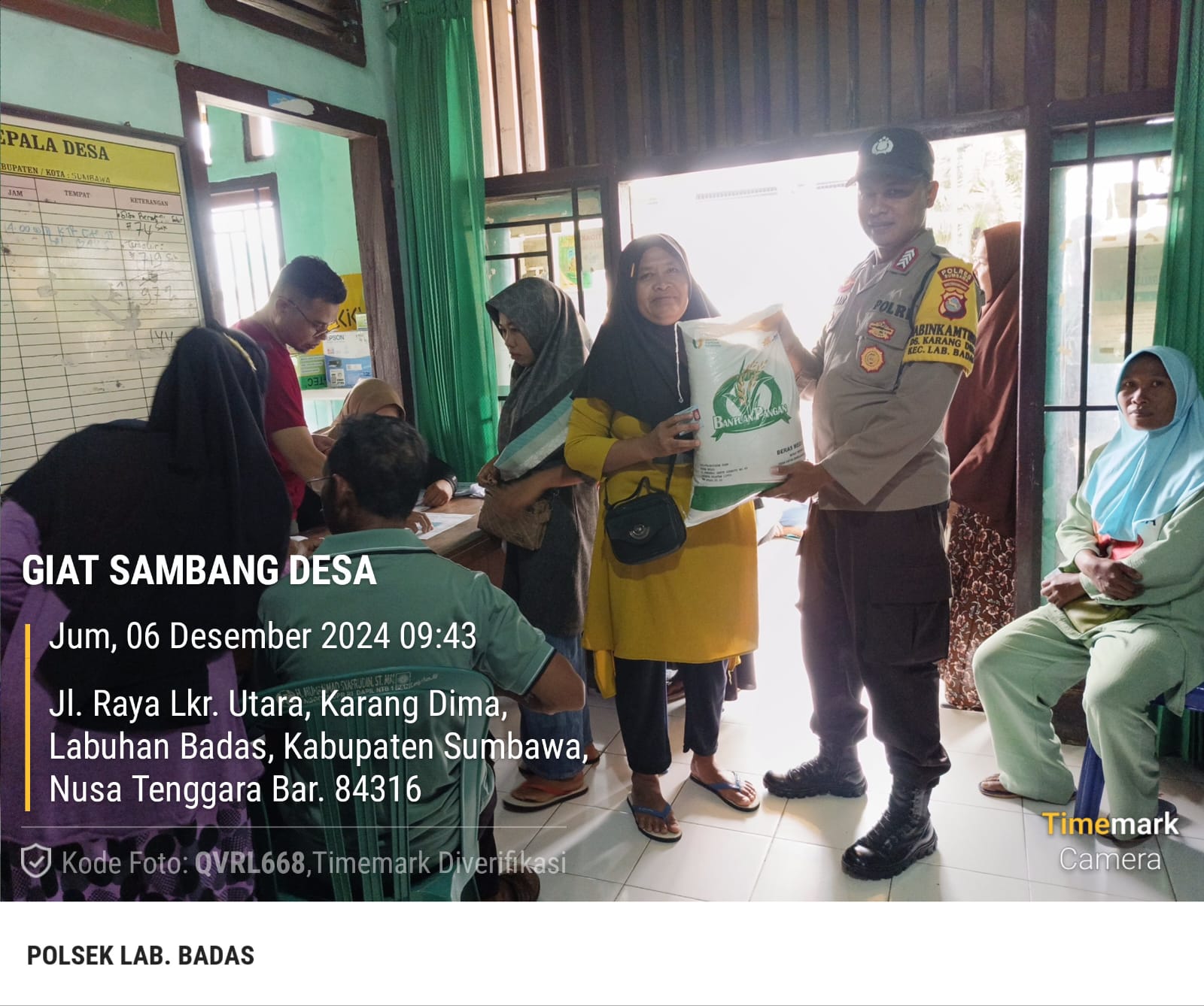 Sumbawa Besar-NTB – Bhabinkamtibmas Desa Karang Dima BRIPKA Akhyar, melaksanakan kegiatan monitoring penyaluran Bantuan Pangan Non Tunai (BPNT) yang bertempat di Kantor Desa Karang Dima, Kecamatan Labuhan Badas, Kabupaten Sumbawa, pada Jumat (6/12/2024) pagi.