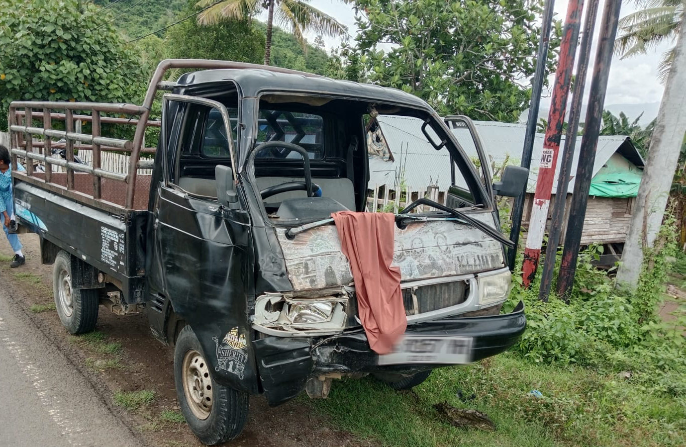 Saat melintasi tikungan La Haja, pengendara sepeda motor diduga kehilangan kendali hingga keluar dari marka jalan dan menabrak mobil pick-up yang melaju dari arah Bima menuju Sumbawa.
