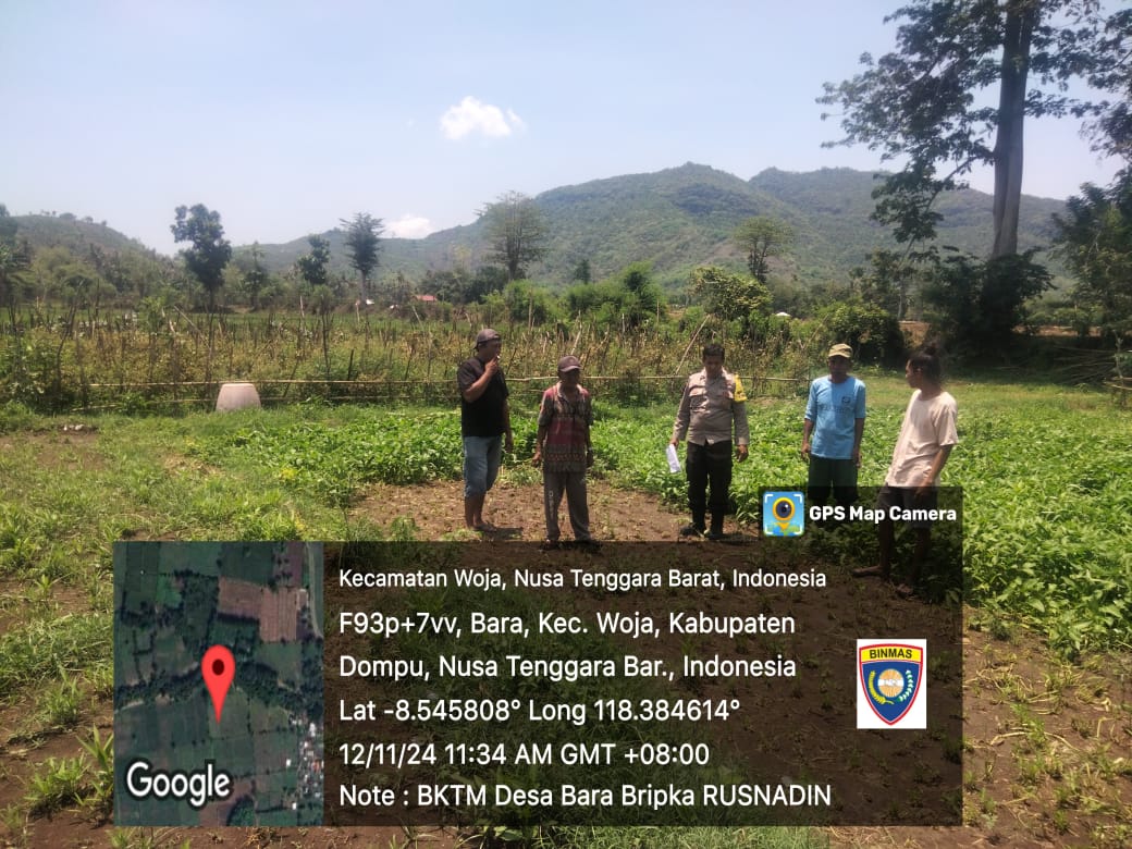 Sebagai bagian dari dukungan terhadap program Ketahanan Pangan Nasional menuju Indonesia Emas 2045, Bhabinkamtibmas Desa Bara, Bripka Rusnadin, melaksanakan pemantauan lahan pekarangan warga pada Kamis (19/12/2024). Kegiatan berlangsung di Dusun Sipon, Desa Bara, Kecamatan Woja, Kabupaten Dompu, dengan fokus pada pemanfaatan lahan yang ditanami palawija.