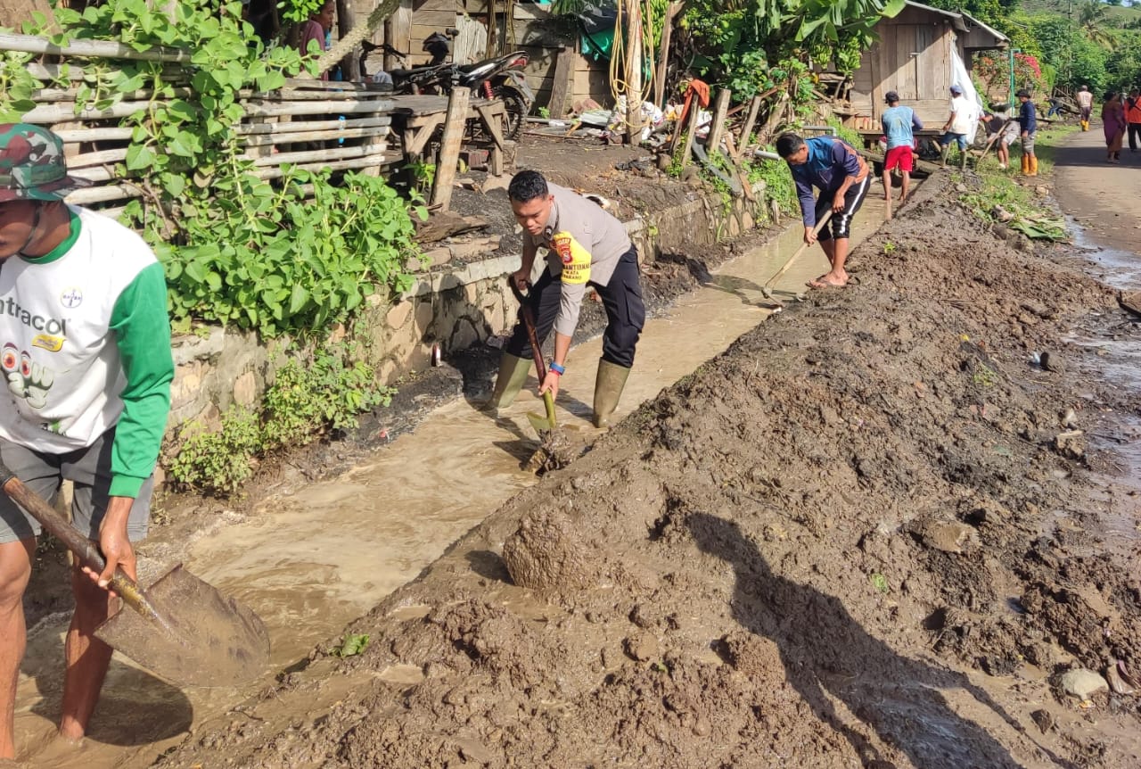 Sumbawa Besar-NTB, Bhabinkamtibmas Desa Mata, BRIPTU Muh. Andy Ramadhan, bersama dengan Babinsa Mata, Koptu Asikin, Kepala Desa Mata Sukirman, perangkat desa, dan masyarakat setempat melaksanakan kegiatan gotong royong pembersihan saluran/parit di Desa Mata, Kecamatan Tarano, Jumat ( 20/12/24) pukul 07.00 WITA.
