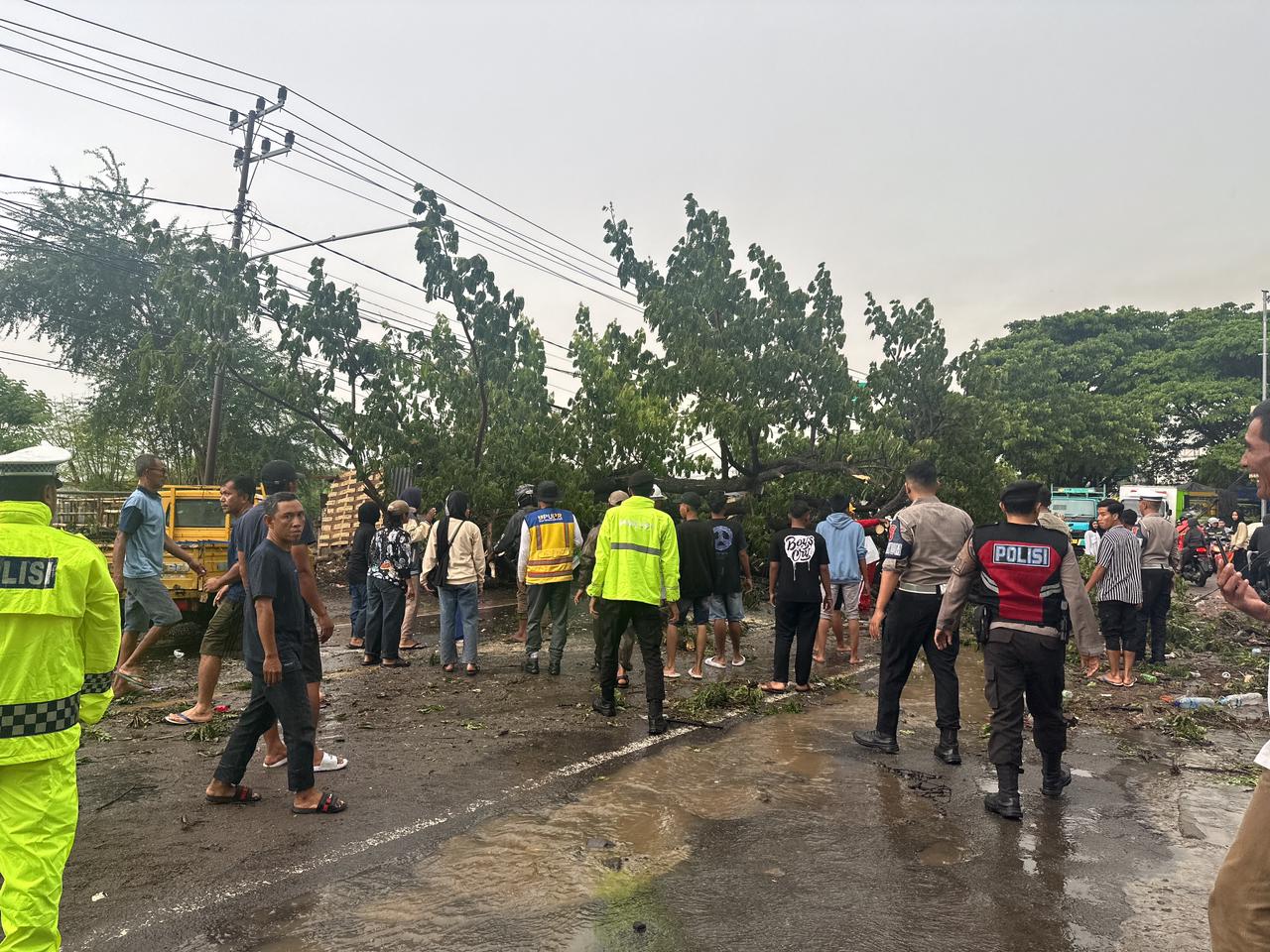 Pohon tersebut tumbang akibat hujan lebat disertai angin kencang, menyebabkan seluruh badan jalan tertutup dan menghambat arus lalu lintas, serta berpotensi membahayakan keselamatan pengguna jalan.