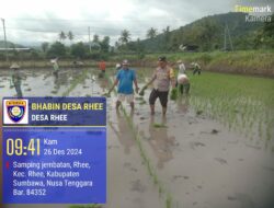 Sumbawa Besar–NTB, Bhabinkamtibmas Desa Rhee, AIPDA Alfian Haris, bersama pemilik sawah Bapak Maswarang dari Kelompok Tani Uma Keban, Desa Rhee, melaksanakan kegiatan menanam padi bersama, Kamis (26/12/24) pagi.