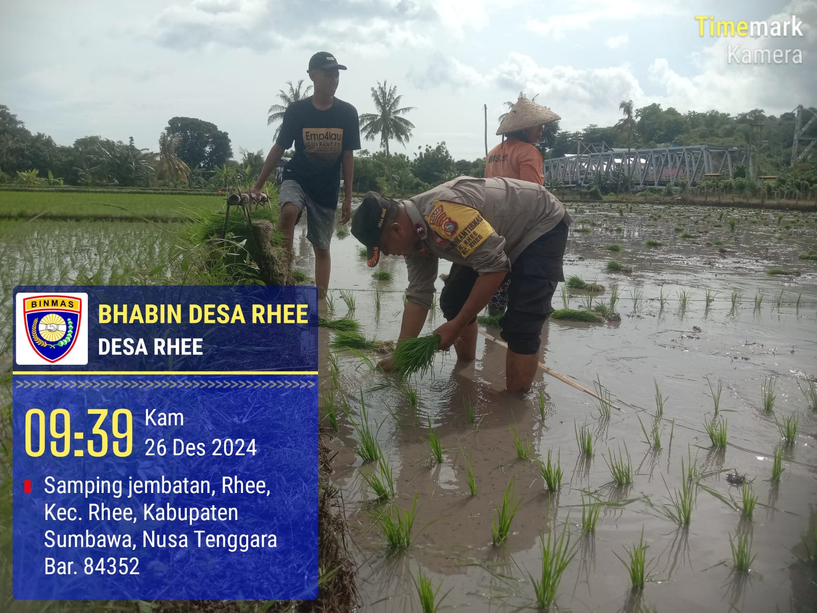 Sumbawa Besar–NTB, Bhabinkamtibmas Desa Rhee, AIPDA Alfian Haris, bersama pemilik sawah Bapak Maswarang dari Kelompok Tani Uma Keban, Desa Rhee, melaksanakan kegiatan menanam padi bersama, Kamis (26/12/24) pagi.