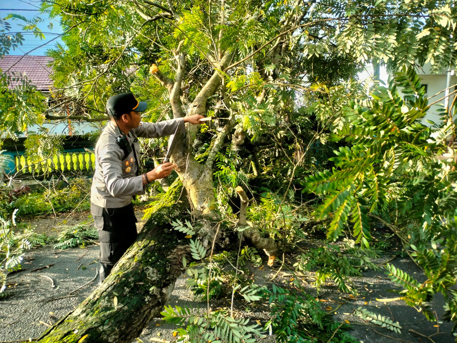 Ia menyampaikan tidak ada korban jiwa maupun kerusakan materi yang ditimbulkan akibat pohon tumbang tersebut.