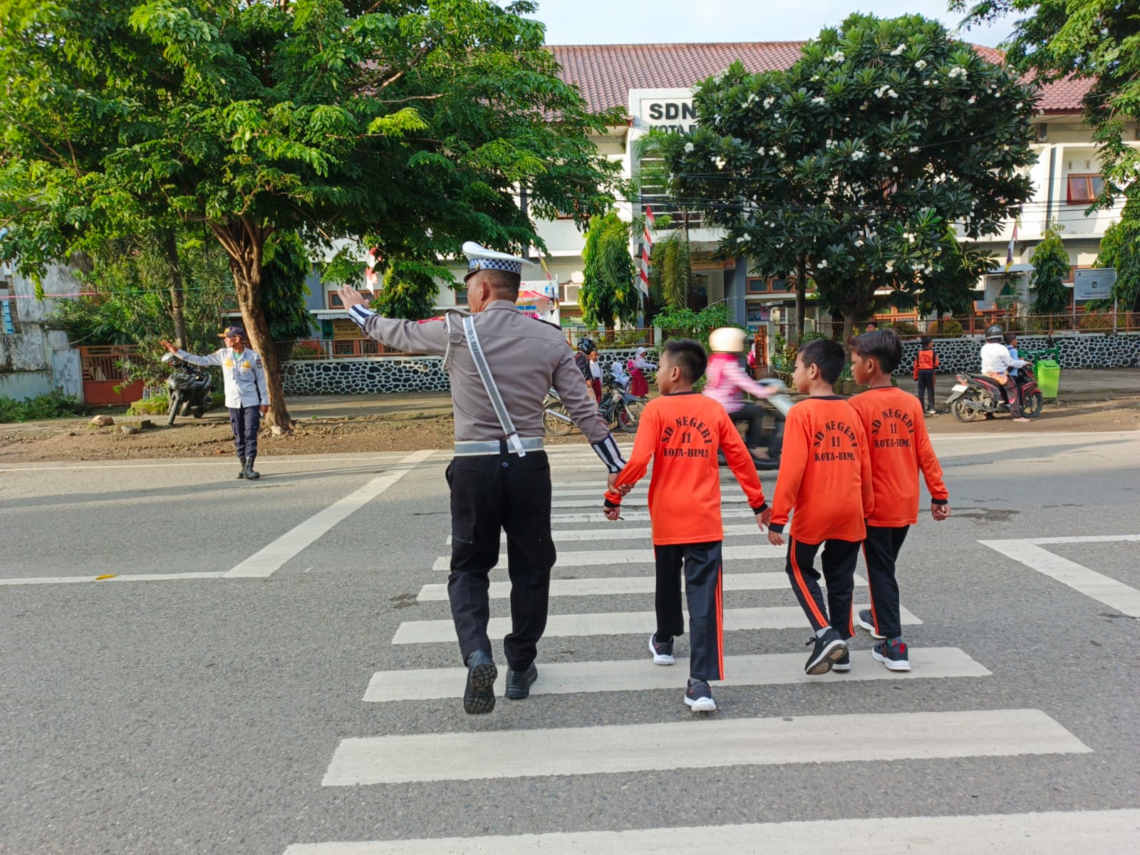 Pastikan Keselamatan Murid Sekolah, Sat Lantas Polres Bima Kota Gatur Lalin Pagi