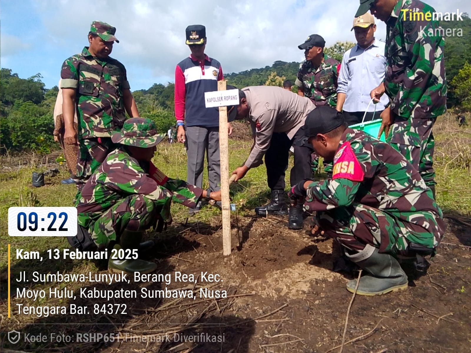 Sumbawa Besar –NTB, Dalam rangka mendukung program penghijauan dan ketahanan pangan, Kapolsek Ropang AKP I Dewa Putu Alit beserta personel Polsek Ropang turut serta dalam kegiatan penanaman pohon yang dilaksanakan di lahan Desa Lenangguar, Kecamatan Lenangguar, Sumbawa, pada Kamis, 13 Februari 2025, pukul 08.30 Wita.