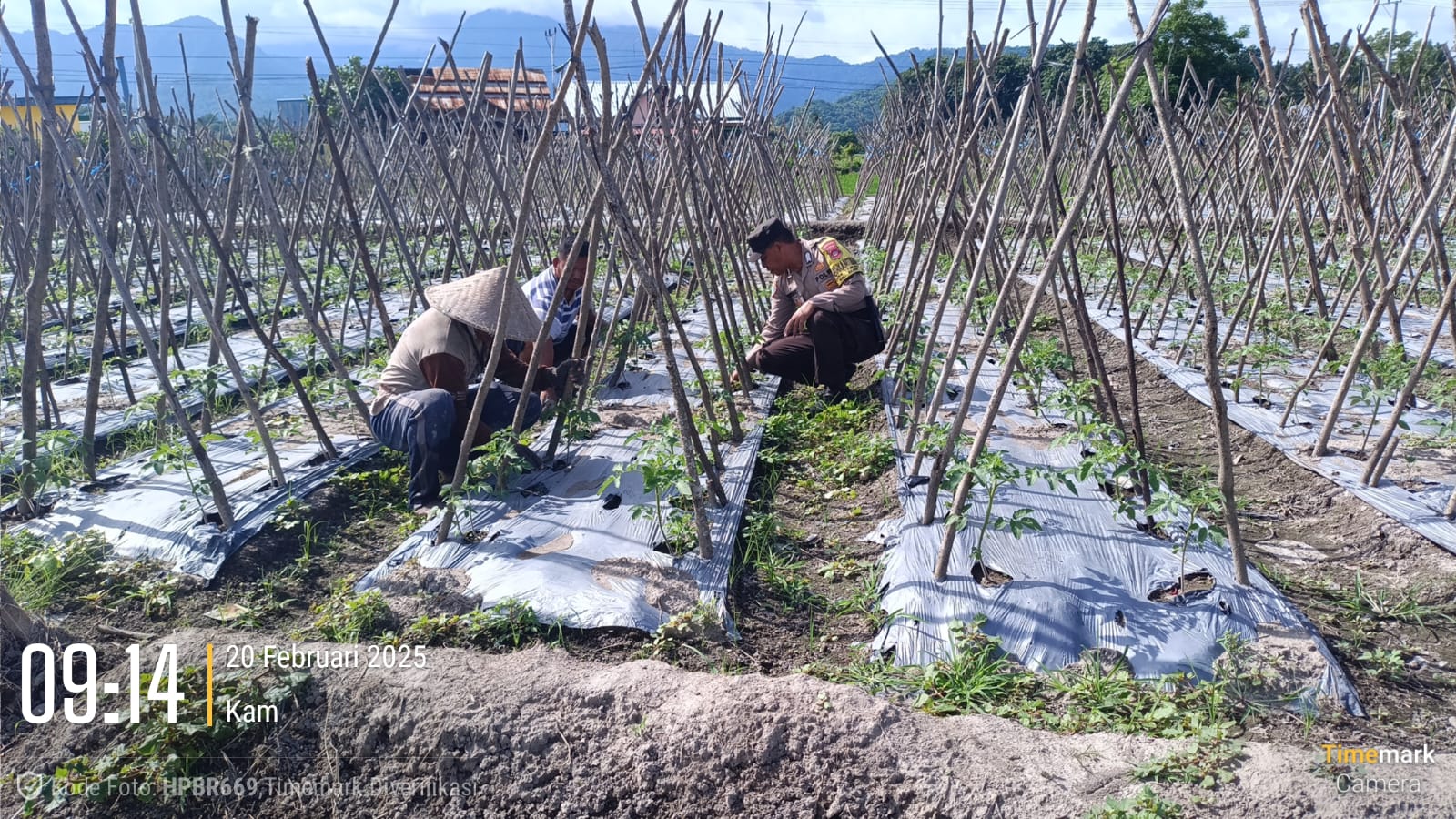 Sumbawa Besar-NTB, Bhabinkamtibmas Desa Tarusa, BRIPKA Heriyanto, melaksanakan kegiatan sambang sekaligus memantau perkembangan tanaman tomat dan cabe milik petani Bapak Aminollah, yang kini tengah fokus menanam sayur mayur hortikultura, Kamis (20/02/25) pagi.