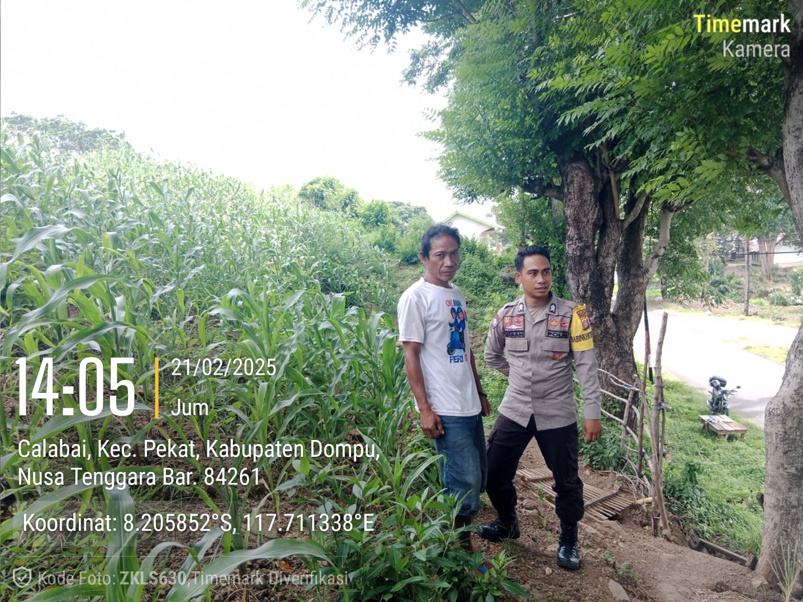 Polsek Pekat melalui Bhabinkamtibmas Desa Calabai, Brigpol Imran, melaksanakan pemantauan lahan pertanian dalam rangka mendukung Program Ketahanan Pangan Nasional Menuju Indonesia Emas 2024. Kegiatan ini berlangsung di Dusun Calabai Atas, Desa Calabai, Kecamatan Pekat, Kabupaten Dompu, pada Jumat (21/2/2025) pukul 14.05 WITA.