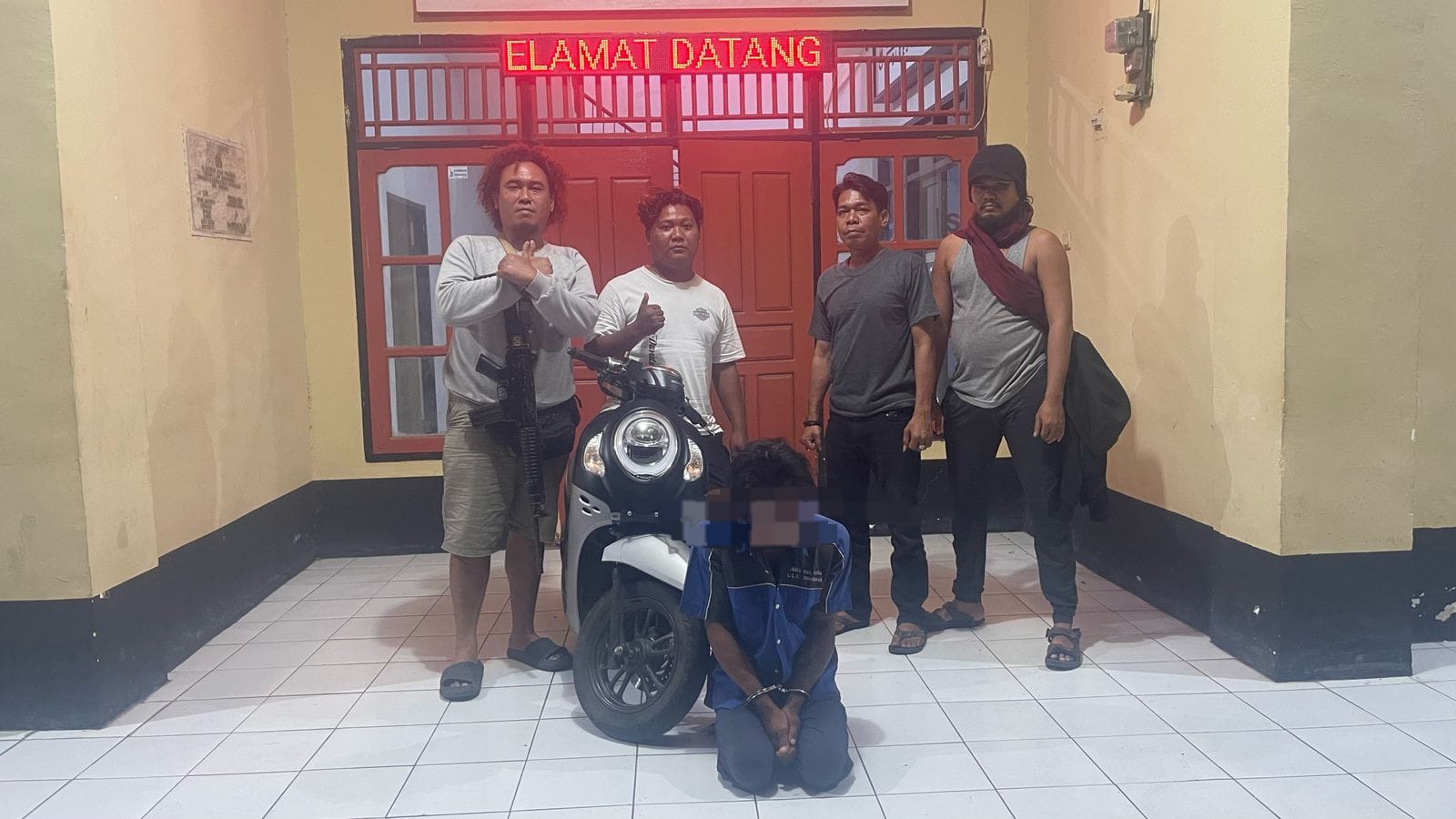Pertama-tama petugas berhasil mengamankan terduga pelaku PMS di wilayah kelurahan Pekat, dimana Ia mengaku kepada petugas bahwa telah menerima gadai motor dari terduga pelaku S, selanjutnya petugas mencari dan mengamankan terduga pelaku S yang saat itu berada tidak jauh dari rumah PMS.