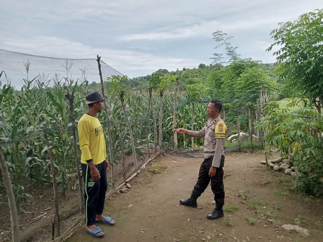 Dalam upaya mendukung Program Ketahanan Pangan Nasional menuju Indonesia Emas 2045, Bhabinkamtibmas Desa Malaju, Aiptu Iwan Setiawan, melaksanakan pemantauan perkembangan tanaman jagung di Dusun Ncoha, Desa Malaju, Kecamatan Kilo, Kabupaten Dompu, Minggu (9/3).