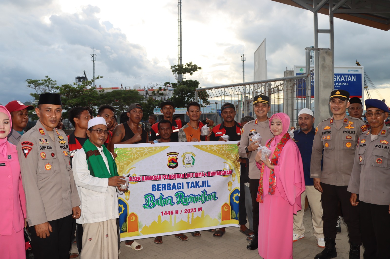 Kota Bima, NTB (11 Maret 2025) – Dalam semangat kepedulian dan kebersamaan di bulan suci Ramadan, Kapolres Bima Kota AKBP Didik Putra Kuncoro, S.I.K., M.Si., bersama Ketua Bhayangkari Cabang Bima Kota, Ny. Mira Didik, menggelar kegiatan berbagi takjil dan buka puasa bersama porter di kawasan Pelabuhan Laut Bima, Selasa (11/03/2025). Kegiatan ini turut didampingi oleh Pejabat Utama (PJU) Polres Bima Kota serta pengurus Bhayangkari Cabang Bima Kota.