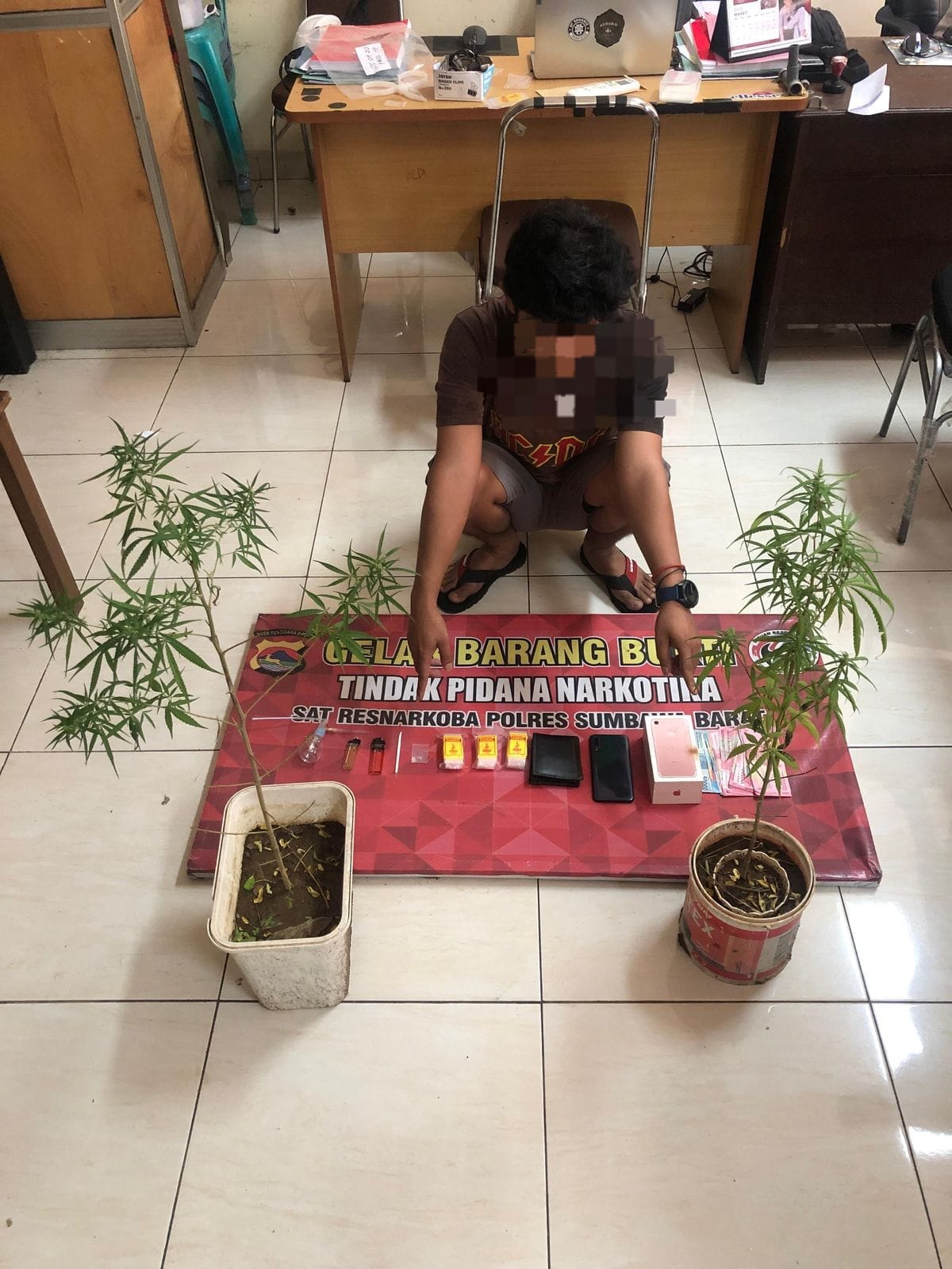 Tersangka (YA) ditangkap oleh Tim Opsnal Sat Resnarkoba bersama barang bukti narkoba bentuk tanaman berupa 2 pot tanaman ganja yang tersangka simpan di belakang rumah tempat tinggalnya. Selain pohon ganja, Tim Opsnal juga mengamankan barang bukti narkotika jenis sabu seberat 0,05 gr, uang tunai Rp 2.200.000,00 (dua juta dua ratus ribu rupiah) serta barang bukti lainnya,” terang Kapolres Sumbawa Barat, AKBP Yasmara Harahap, S.I.K., melalui Kasi Humas, AKP Zainal Abidin, S.H.