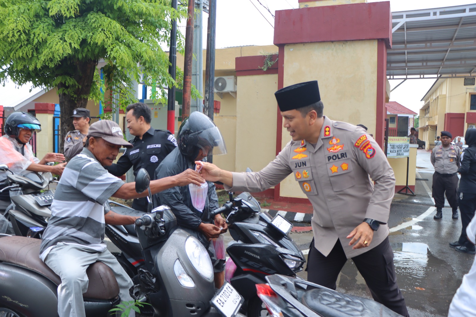 Sumbawa Besar–NTB, Dalam rangka menyambut bulan suci Ramadan, Kapolres Sumbawa, AKBP Bagus Nyoman Gede Junaedi SH, S.IK, M.AP., bersama dengan gabungan staf yang terdiri dari Bag Ren, SPKT, Humas, serta Bhayangkari, melaksanakan kegiatan sosial bagi-bagi takjil kepada masyarakat. Kegiatan ini dilaksanakan menjelang waktu berbuka puasa di depan Mapolres Sumbawa pada Senin, 17 Maret 2025.
