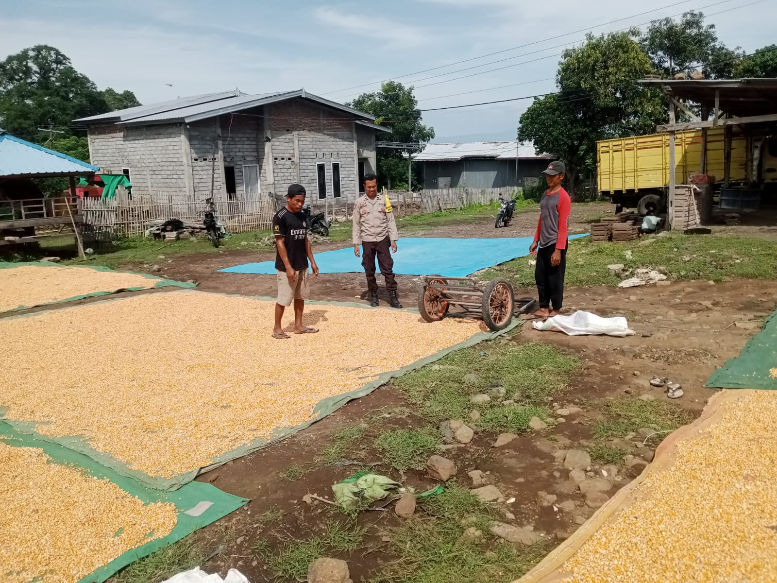 Dalam kegiatan tersebut, AIPTU IWAN SETIAWAN turut berinteraksi dengan pemilik lahan dan kelompok tani setempat untuk memantau hasil panen serta kendala yang dihadapi petani. Berdasarkan pemantauan, lahan seluas 1 hektare tersebut menghasilkan sekitar 4 ton jagung kering dengan harga jual Rp 4.400 per kilogram kepada pembeli bernama Ilias.