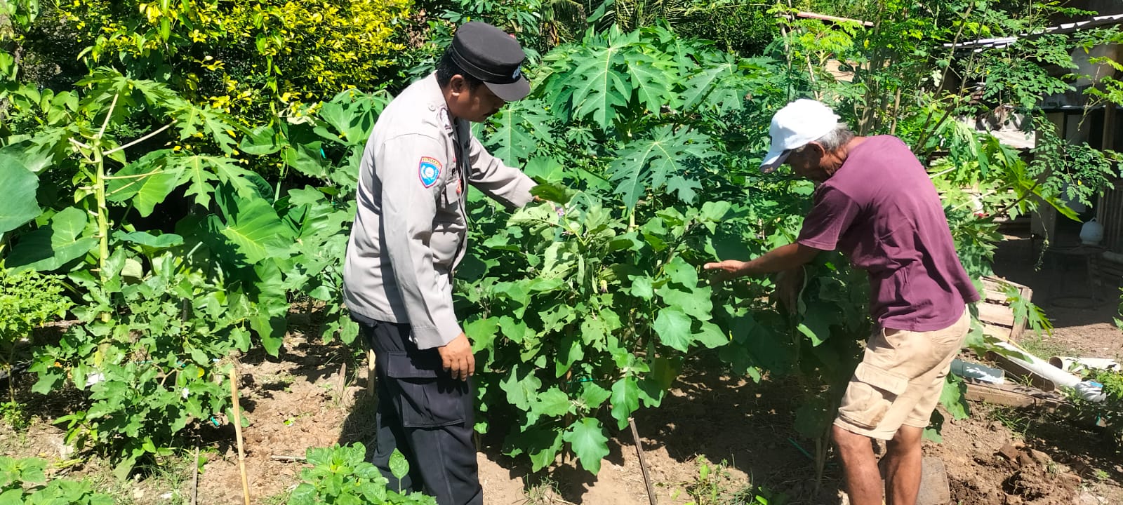 Bripka Ramli mengunjungi pekarangan milik seorang warga binaan yang telah memanfaatkan lahan pekarangannya untuk menanam cabai, terong, dan tanaman bergizi lainya.