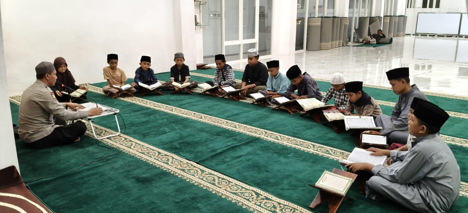 Salah satunya seperti yang dilakukan oleh Aipda Sarjan yang melakukan kegiatan diluar tugas Kepolisian dengan semangat memberikan pelajaran mengaji iqro dan ilmu agama islam kepada anak-anak.