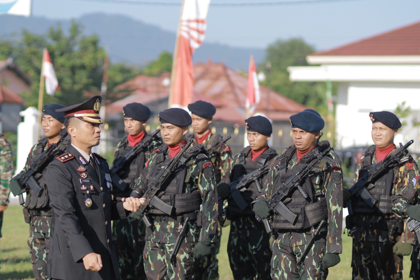 Barisan peserta upacara dari berbagai unsur, mulai dari TNI, Brimob, Samapta, Polairud, staf dan Polsek jajaran, Bhabinkamtibmas, Sat Lantas, Sat Reskrim, Sat Intelkam, Satpol PP, Tagana, hingga BPBD, Pecalang, dan pelajar. Mereka membentuk komposisi pasukan yang mencerminkan sinergi dan soliditas lintas lembaga di Gumi Tioq Tata Tunaq.