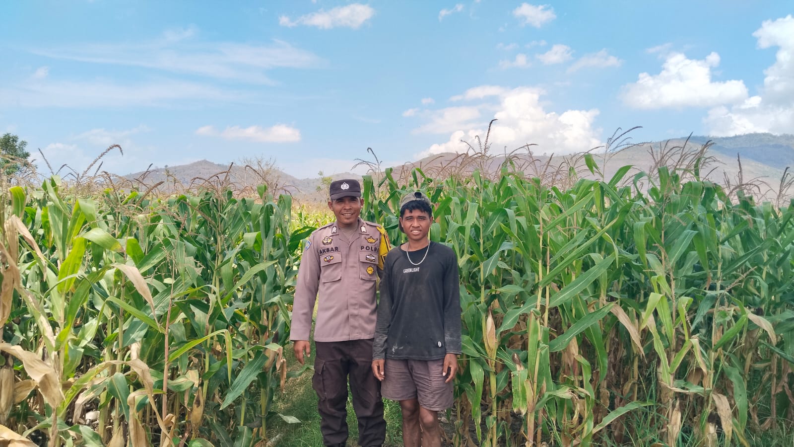 Bhabinkamtibmas Desa Mumbu Polsek Woja, Brigadir Akbar, melaksanakan kegiatan pemantauan lahan jagung milik warga dalam rangka mendukung Program Ketahanan Pangan Nasional menuju Indonesia Emas 2045.