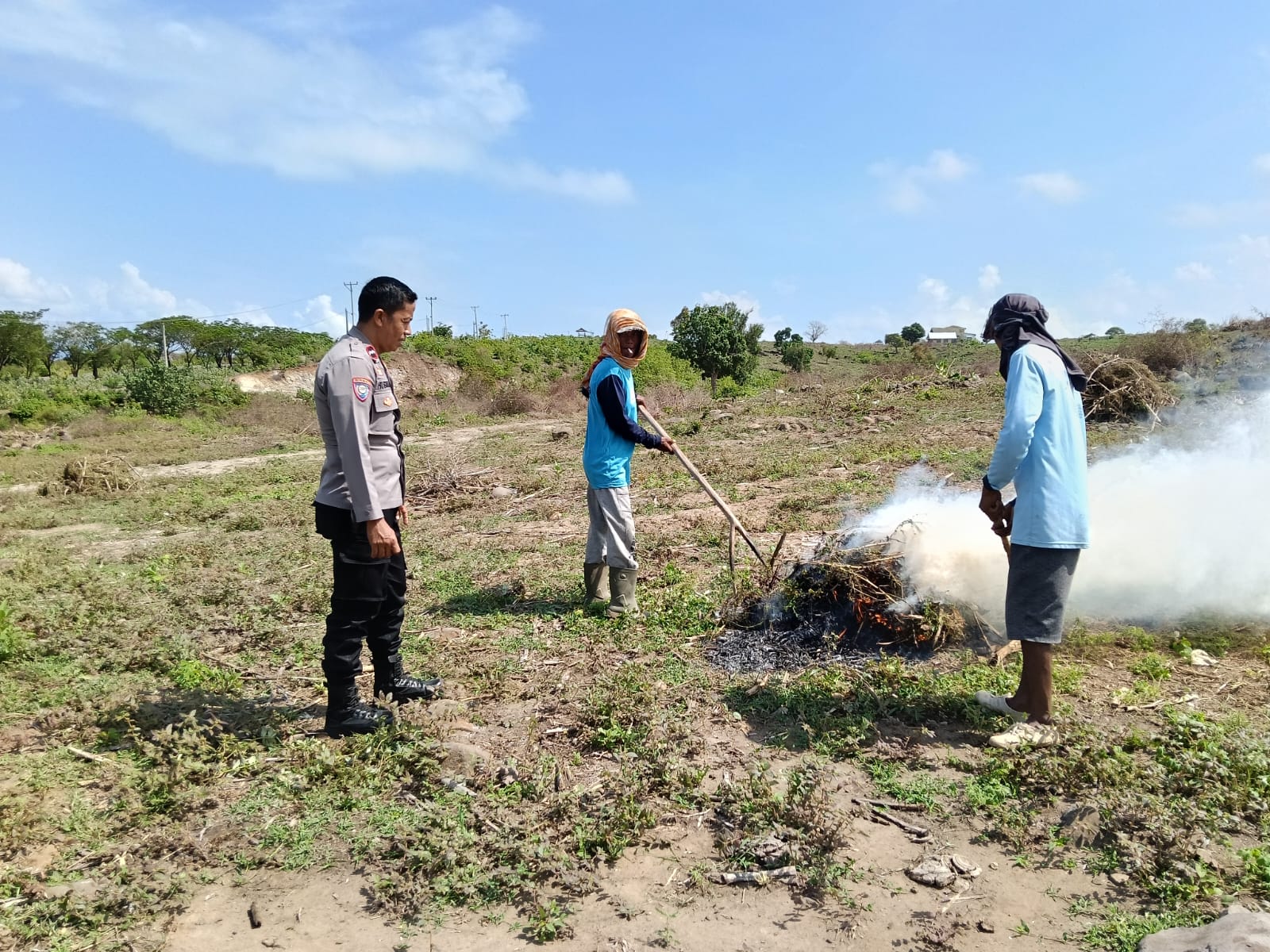 Pada kesempatan tersebut, Aipda M. Husnin menemui para petani yang sedang membersihkan lahan untuk persiapan penanaman jagung pola pertama. Ia juga mengajak warga agar memanfaatkan pekarangan rumah dengan menanam sayuran sebagai kontribusi nyata dalam mendukung program pemerintah menuju Indonesia Emas.