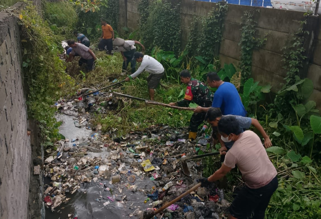 Bintara Pembina Desa (Babinsa) Jempong Baru, Komando Rayon Militer (Koramil) 1606-09/Ampenan, Serka Samsuri, bersama Kepala Lingkungan (Kaling) I Ketut Pardana Putra dan warga setempat, bahu membahu membersihkan tumpukan sampah di aliran sungai yang mulai menghambat arus air.