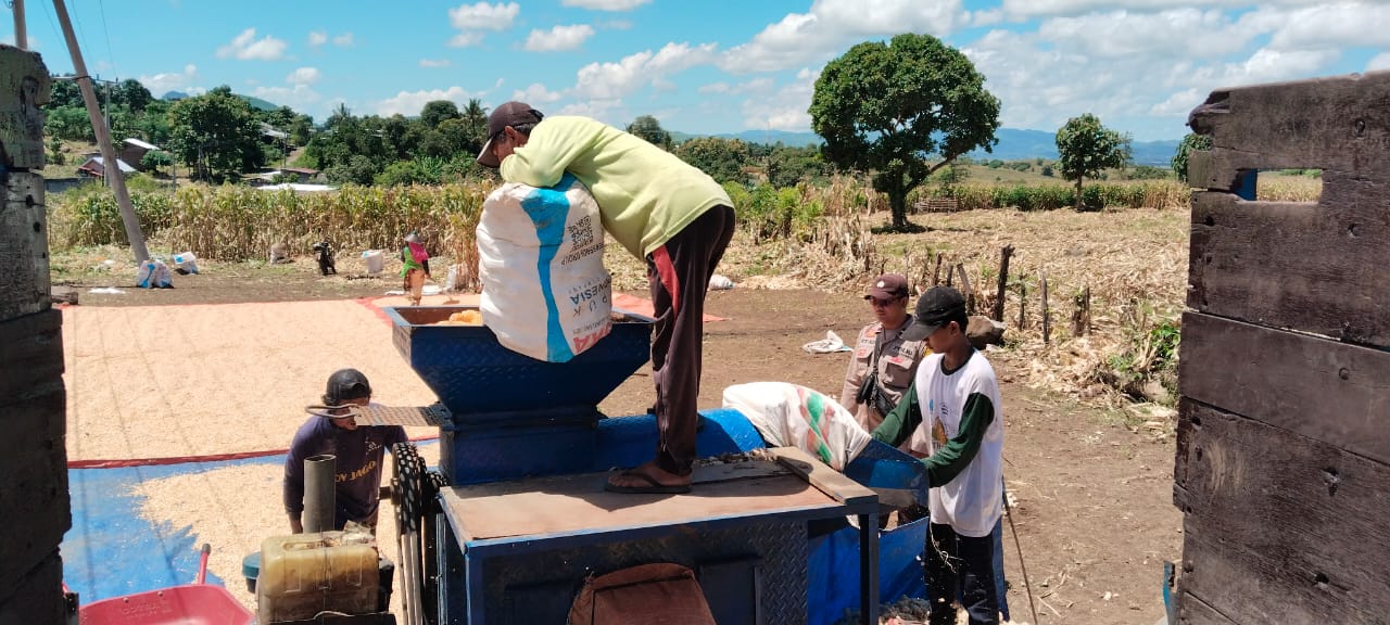 Bhabinkamtibmas Desa Taropo, AIPDA I Putu Adi Kamajaya, menghadiri dan memantau langsung panen raya jagung di lahan milik Komariah yang terletak di Dusun Tolonggeru, Desa Taropo, Kecamatan Kilo, Kabupaten Dompu, Sabtu (1/3).