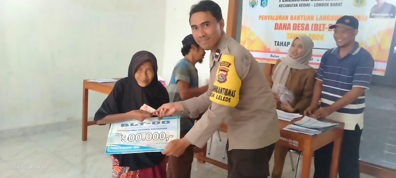 Lombok Barat, NTB – Pendistribusian Bantuan Langsung Tunai Dana Desa (BLT DD) tahap IV untuk bulan Oktober, November, dan Desember tahun 2024 di Desa Lelede, Kecamatan Kediri, Kabupaten Lombok Barat, Nusa Tenggara Barat (NTB), berjalan lancar dan aman pada Senin (16/12/2024). Kegiatan yang dimulai pukul 09.00 WITA di Aula Kantor Desa Lelede ini mendapatkan pengamanan dari Polsek Kediri, Polres Lombok Barat, Polda NTB, guna memastikan ketertiban dan keamanan selama proses penyaluran.