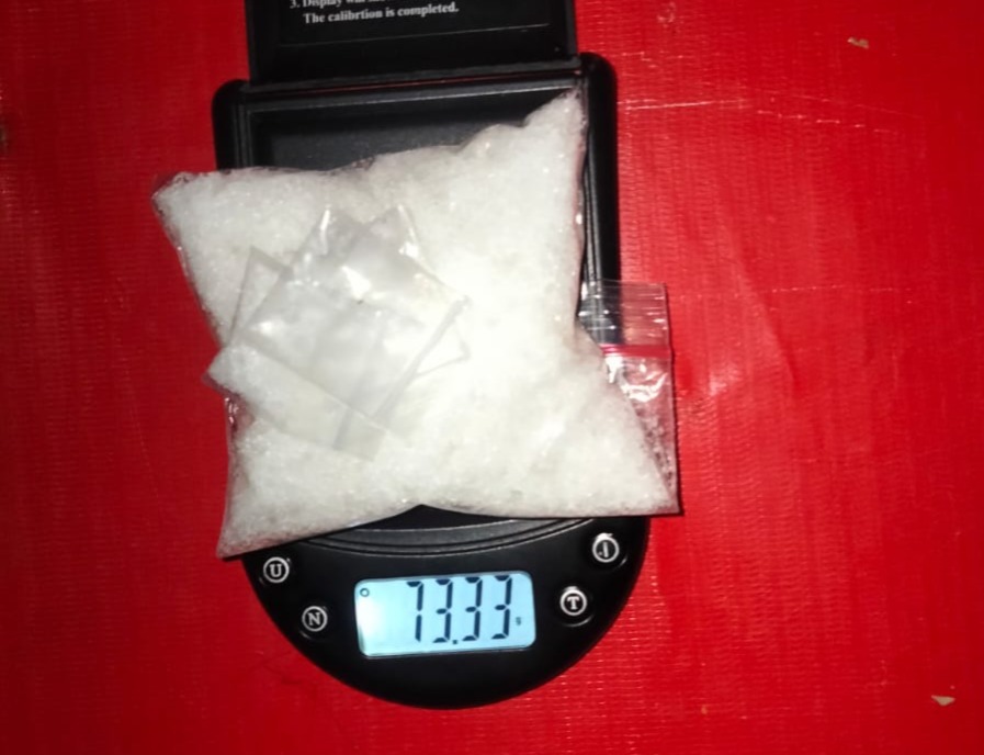 1 bungkus plastik klip berisi kristal diduga sabu (berat bruto 71,07 gram), dibungkus menggunakan tisu, 1 pucuk senjata api rakitan, 1 butir peluru aktif, Total barang bukti sabu yang berhasil diamankan dari dua lokasi tersebut adalah 73,33 gram.