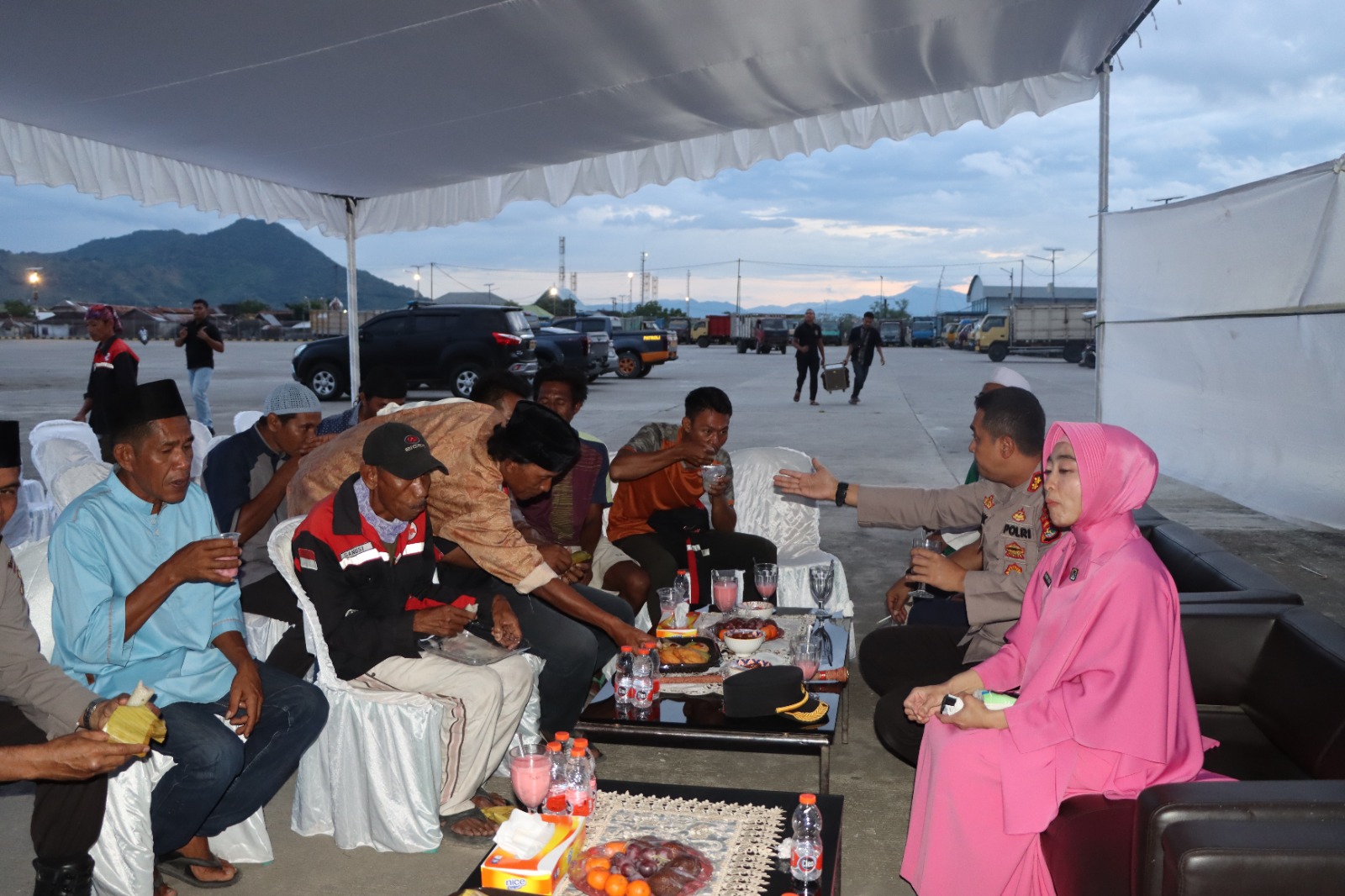 Kota Bima, NTB (11 Maret 2025) – Dalam semangat kepedulian dan kebersamaan di bulan suci Ramadan, Kapolres Bima Kota AKBP Didik Putra Kuncoro, S.I.K., M.Si., bersama Ketua Bhayangkari Cabang Bima Kota, Ny. Mira Didik, menggelar kegiatan berbagi takjil dan buka puasa bersama porter di kawasan Pelabuhan Laut Bima, Selasa (11/03/2025). Kegiatan ini turut didampingi oleh Pejabat Utama (PJU) Polres Bima Kota serta pengurus Bhayangkari Cabang Bima Kota.