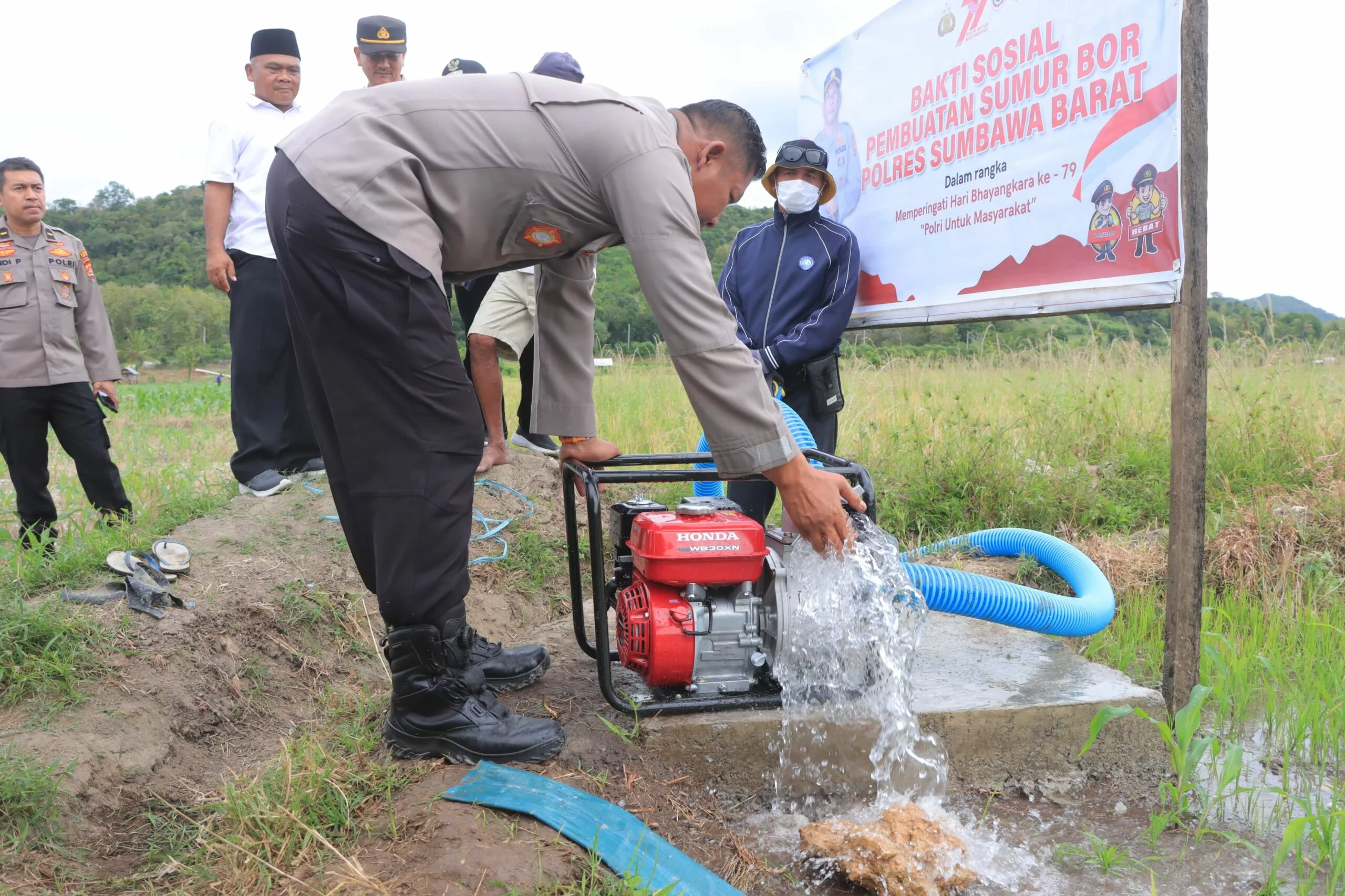 Sumbawa Barat, NTB – Dalam rangka memperingati Hari Bhayangkara ke-79 Tahun 2025, Kapolres Sumbawa Barat AKBP Zulkarnain, S.I.K. secara resmi meresmikan dan menyerahkan bantuan sumur bor kepada dua kelompok tani di Desa Beru, Kecamatan Jereweh, Kabupaten Sumbawa Barat. Kegiatan berlangsung pada hari Rabu, 25 Juni 2025 pukul 10.30 WITA, bertempat di areal persawahan Desa Beru.