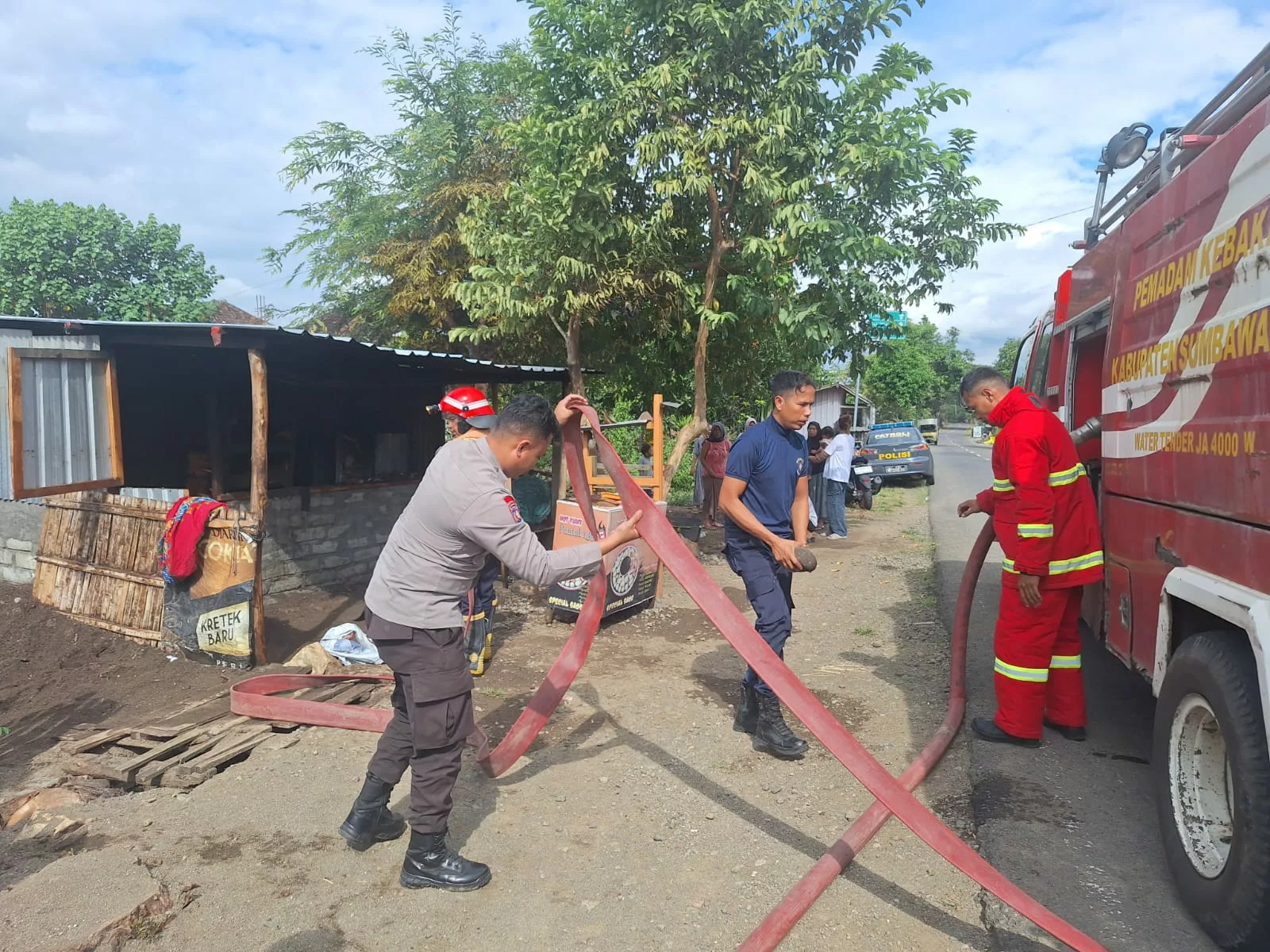 Upaya pemadaman api sempat dilakukan oleh petugas Polsek, personel Koramil setempat, dan warga sekitar sebelum mobil pemadam kebakaran tiba.