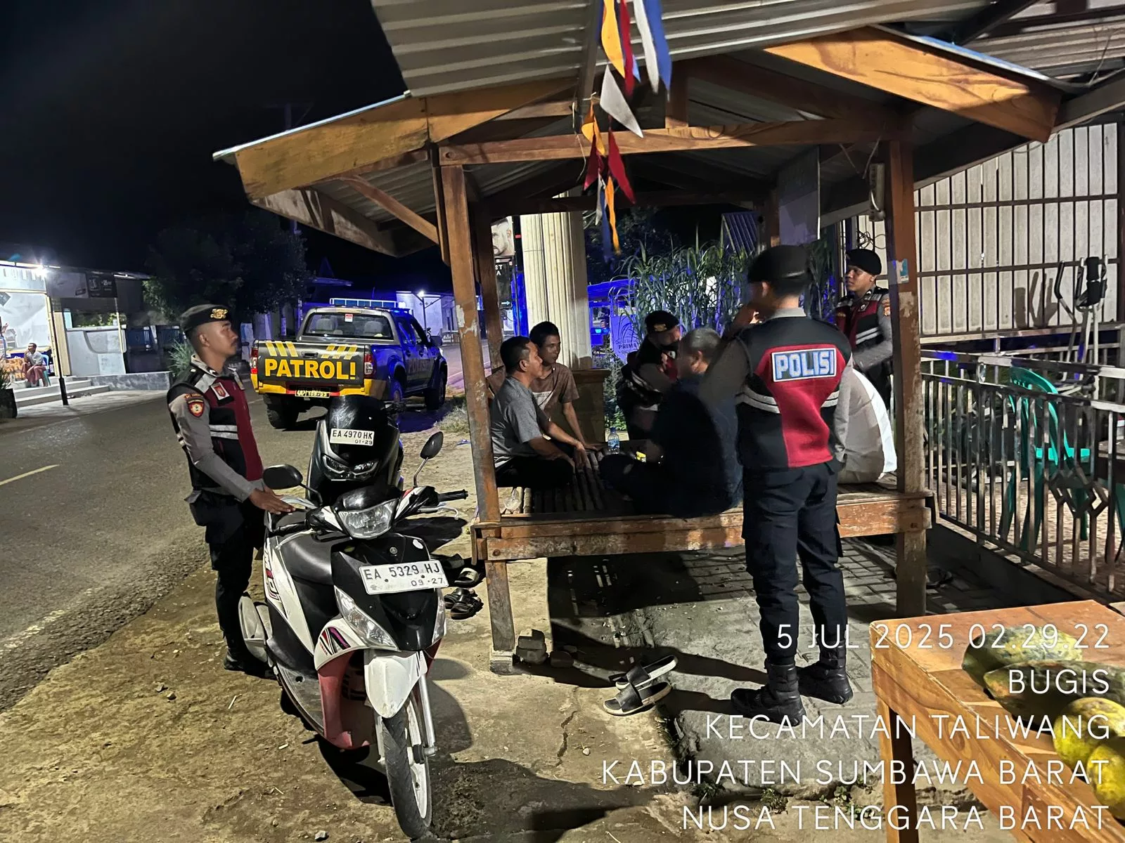 Sumbawa Barat, NTB – Dalam upaya menjaga keamanan dan ketertiban masyarakat (kamtibmas), Satuan Samapta Polres Sumbawa Barat melaksanakan patroli dialogis pada Sabtu dini hari, 5 Juli 2025, sekitar pukul 02.00 hingga 03.00 WITA. Patroli tersebut berlangsung di wilayah Kelurahan Bugis, Kecamatan Taliwang, Kabupaten Sumbawa Barat.