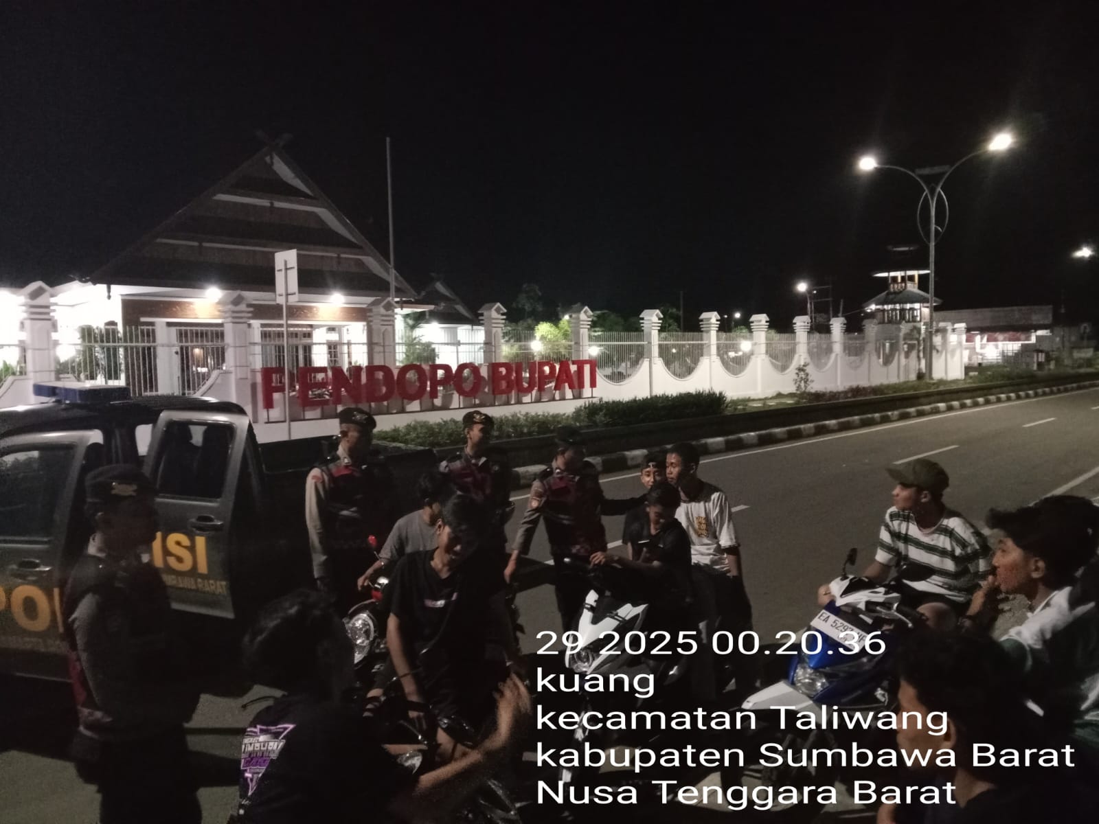 Selama patroli, petugas Polres Sumbawa Barat bertemu dengan sekelompok remaja yang sedang berada di taman kota. Dalam kesempatan tersebut, anggota patroli melakukan dialog dengan para remaja yang begadang, selain dialog petugas juga melakukan pemeriksaan badan dan kendaraan untuk mengantisipasi para remaja membawa senjata tajam (sajam) maupun benda lain seperti minunan keras, narkoba dan lain – lain, serta memberikan imbauan terkait larangan mengonsumsi minuman keras (miras), narkoba, dan sejenisnya.
