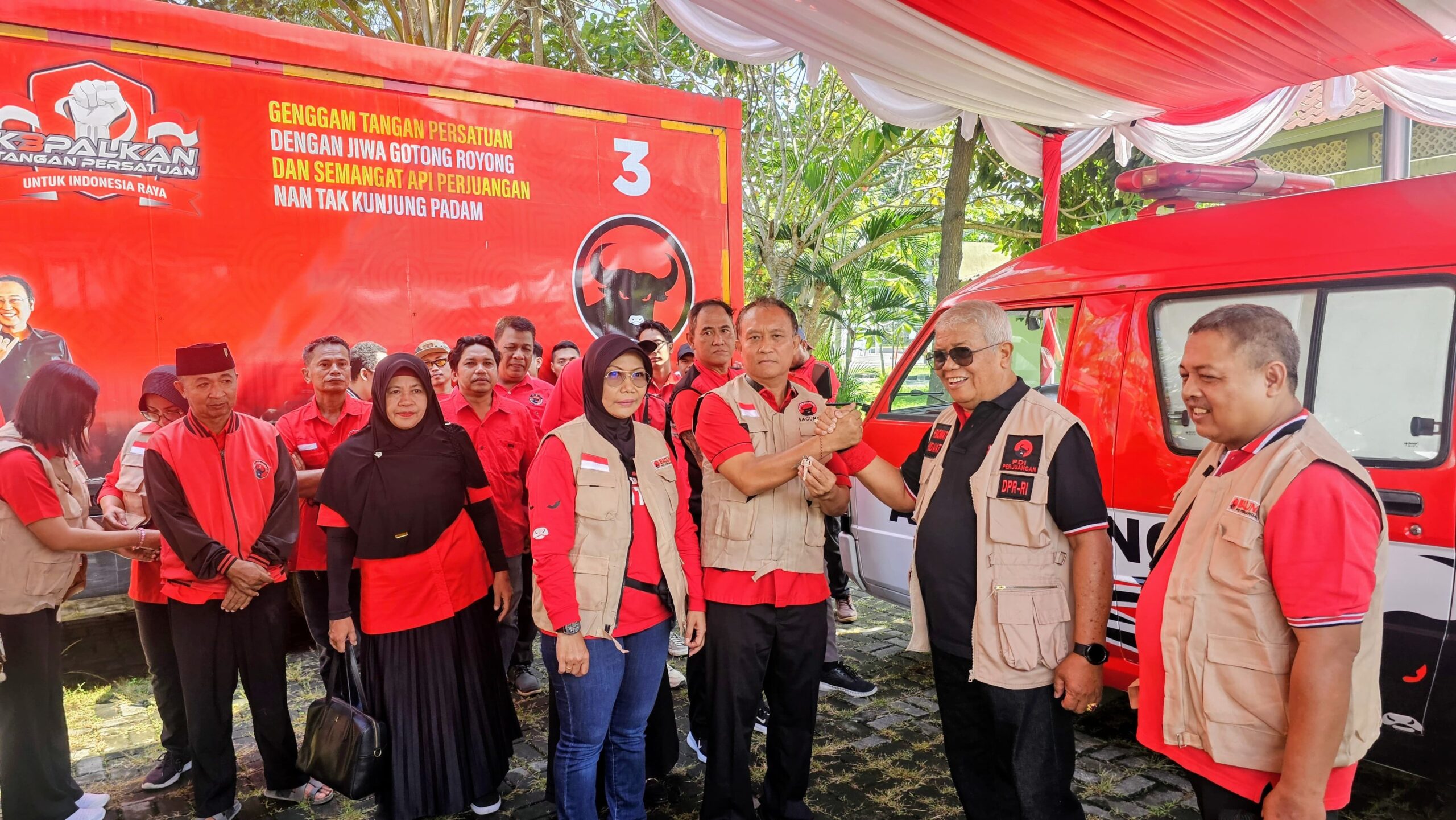 Bantuan DPP PDI Perjuangan tersebut antara lain berupa obat-obatan, pulunan alat high presure washer untuk penyemprotan endapan lumpur, bantuan pakaian, kendaraan ambulans, dan rompi BAGUNA.