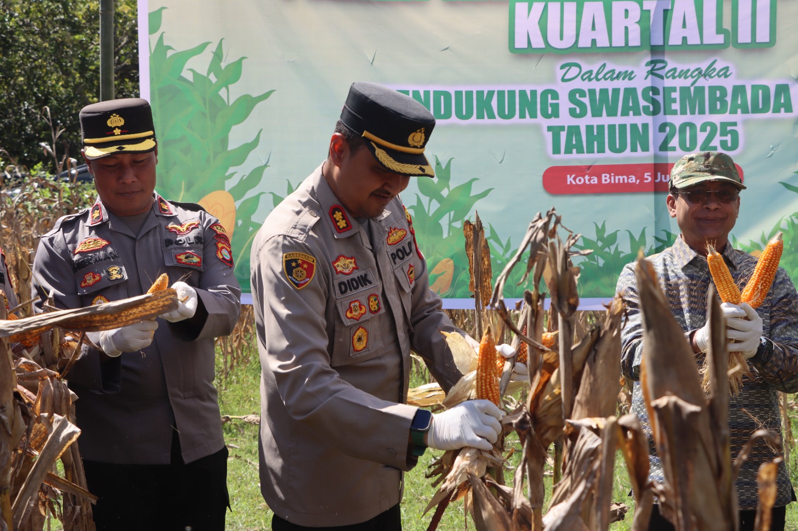 Kota Bima, NTB (6 Juni 2025) – Dalam rangka mendukung Asta Cita Presiden RI Prabowo Subianto terkait ketahanan pangan nasional, Polres Bima Kota menggelar Panen Raya Jagung Serentak Kuartal II Tahun 2025 di lahan pertanian So Sinde, RT.012/RW.004, Kelurahan Oimbo, Kecamatan Rasanae Timur, Kota Bima, pada Kamis (5/6/2025) siang.