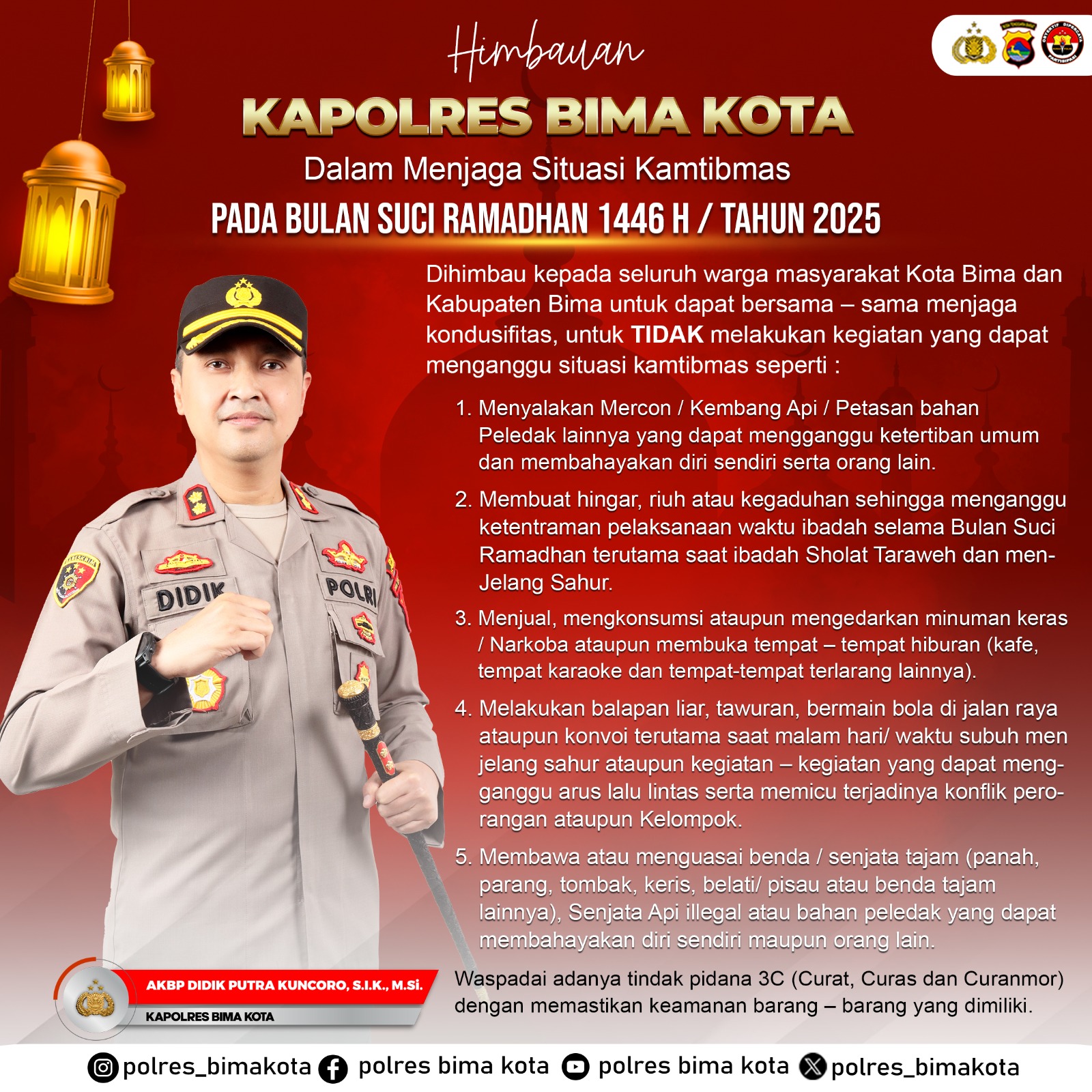Kapolres Bima Kota mengimbau kepada seluruh warga masyarakat Kota Bima dan Kabupaten Bima untuk bersama-sama menjaga kondusifitas dan menghindari berbagai aktivitas yang dapat mengganggu keamanan dan ketertiban selama bulan Ramadhan. Beberapa hal yang ditekankan dalam imbauan tersebut antara lain: