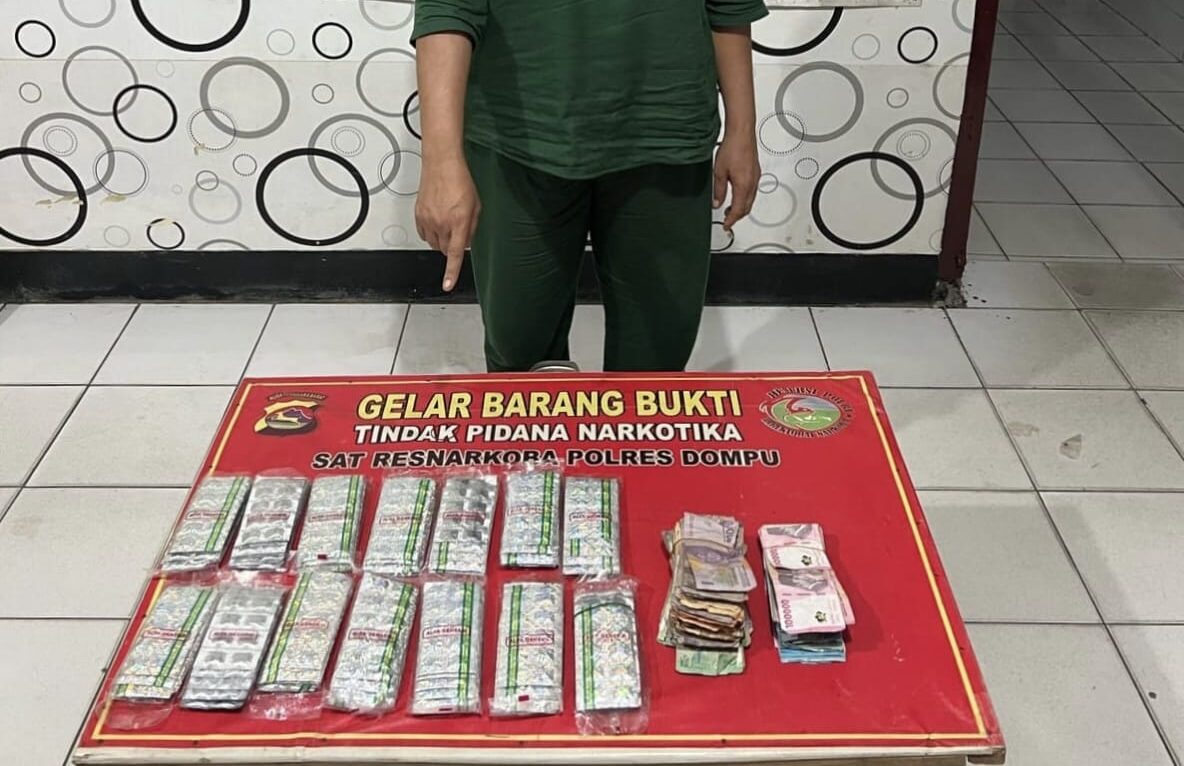 Seorang ibu rumah tangga berinisial ST (50) diciduk Tim Opsnal Satresnarkoba Polres Dompu karena diduga mengedarkan obat keras jenis tramadol tanpa izin. Dari tangan tersangka, polisi mengamankan 1.390 butir pil tramadol dan uang tunai Rp 8.060.000, yang diduga hasil penjualan obat ilegal tersebut.