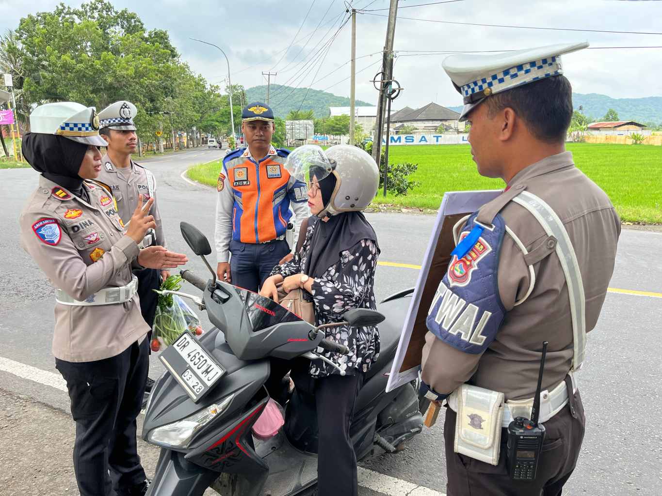 “Hari ini, kami melaksanakan kegiatan stasioner Ops Keselamatan Rinjani 2025 di Simpang 3 Imam Bonjol. Ada yang berbeda dalam kegiatan kali ini, yaitu kami memberikan reward berupa sayuran kepada pengguna jalan yang tertib berlalu lintas,” ujar Iptu Dina Rizkiana di lokasi kegiatan.