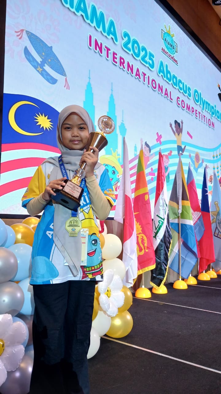Malaysia : – Seorang siswi kelas 7 dari SMP Al Zahra Indonesia Jasmine Az-Zahra , baru saja mencapai prestasi luar biasa dengan meraih 1st Place pada *Kompetisi Abacus Olympiad International* Group E, yang diadakan pada 20 Juli 2025 di Shah Alam, Selangor, Malaysia.